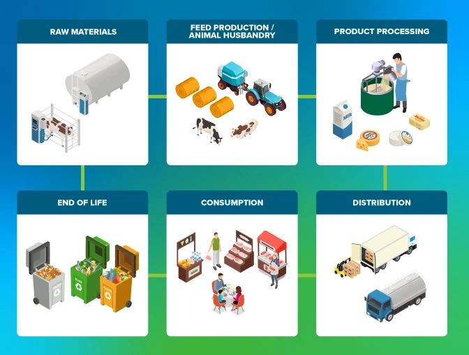 LCA is an internationally recognised method that takes a ‘bird’s-eye view’ of livestock and food production and the impact of that on the environment. A complex tool, it draws on huge databases and local information to analyse resource use and environmental emissions associated with a product or system. It also accounts for the impacts from the extraction of raw material and all production inputs. LCA covers the full life cycle of a product, from raw material extraction to disposal - including processing, transport, retail, consumer, and waste.