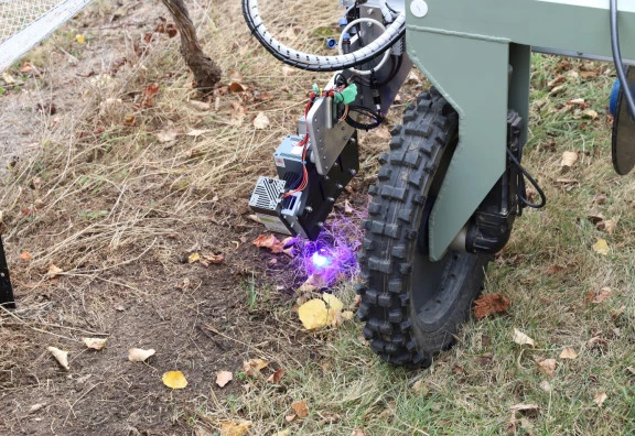 AgResearch's Cameron Craigie and Dougal Ferguson (right) showcased our weed zapping technology at the Robotics Forum in California.