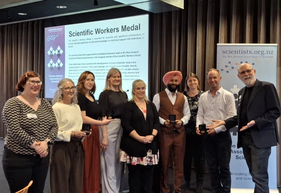 The New Zealand Association of Scientists’ (NZAS) Scientific Workers Medal was yesterday (Wednesday 26 November) presented to a multidisciplinary team of technicians from the Bioeconomy Science Institute.