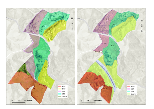 The four self-contained farmlets include two farmlets that received low (LF) and two that received high (HF) P fertiliser inputs from 1975-1980. Since 1980, one of the LF farmlets has continued to receive 125 kg superphosphate (SSP)/ha/yr (LFLF) and one of the HF farmlets has received 375 kg SSP/ha/yr (HFHF). The other LF and HF farmlet have received no further inputs (LFNF and HFNF, respectively). Monitoring of the HFNF stopped in 2022 with the development of the new road impacting too many permanent experimental sites.